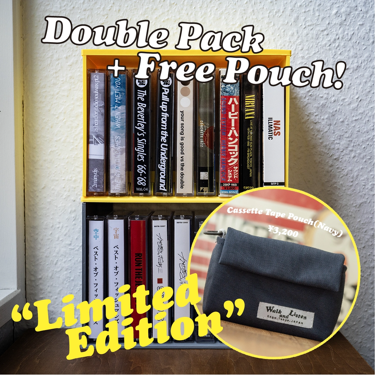 *個数限定でCassette Tape Shelf Kit – Double Pack[Yellow x Gray]をご購入の方にCassette Tape Pouch(Navy)を1個プレゼントします。なくなり次第終了です。